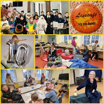 Kinder, wie die Zeit vergeht! 10 Jahre Lesecafé an unserer Grundschule! Das musste zünftig gefeiert werden. So folgten zahlreiche große und kleine Geburtstagsgäste der Einladung des 3. Schuljahrs, die die Jubiläumsveranstaltung mit lustigen Karnevalsliedern und -reimen eröffnete, bevor die Schulleiterin Frau Brenner Grußworte aussprach und Ehrungen vornahm. Das Lesecafé findet seit dem 5. Februar 2015 regelmäßig statt und wurde von der frühreren Kollegin Corina Perl-Laux ins Leben gerufen. Seitdem erfreut es sich großer Beliebtheit. Jeder Gast erhält einen Gutschein für ein Buch, ein Getränk und ein Stück Kuchen. Beachtlich ist, dass der gesamte Bestand an Kinder- und Erwachsenenbüchern ausschließlich aus Buchspenden besteht. Zu jedem Lesecafé kommen neue Bücher hinzu. Auch können gelesene Bücher wieder mitgebracht und umgetauscht werden. Für die Kinder werden am Nachmittag eine Kinderleselandschaft sowie mehrere Vorlesezeiten angeboten. Die Kreativwerkstatt lädt zum Basteln und die Cafeteria zum Verweilen ein.