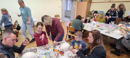 "In der Osterhasenmalerwerkstatt" - so heißt tatsächlich ein Lied im Oster-Singspiel "Ich bin stark!", das alle Kinder zurzeit für die großen Aufführungen am 29. März einüben. Da aber nicht nur gemalt, sondern auch für viele Kostüme und Requisiten gebastelt, geknüpft und geklebt werden sollte, trafen sich viele Kinder, Eltern, Großeltern und Lehrer zur Osterhasenwerkstatt, um gemeinsam zur Tat zu schreiten.