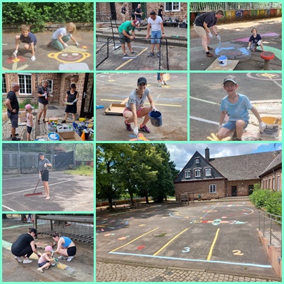 Dass die Farbe schnell trocknen würde, daran hatte keiner der Helfer bei der diesjährigen Schulhofaktion Zweifel. Und so wanderten - nach einer kleinen Kehraktion - viele Pinsel in kleine und große Hände. Zur Mittagszeit dann erschien das Antlitz des Schulhofs in leuchtend bunten Farben, die von Eltern sowie von Antony Farben Trier freundlicherweise gespendet wurden. Vielen Dank! Danke auch an alle Fleißigen vor Ort, ganz besonders aber an Frau Lehnen, die, trotz der anstehenden Mini-EM, auch diese Aktion organisiert und durchgeführt hat.
